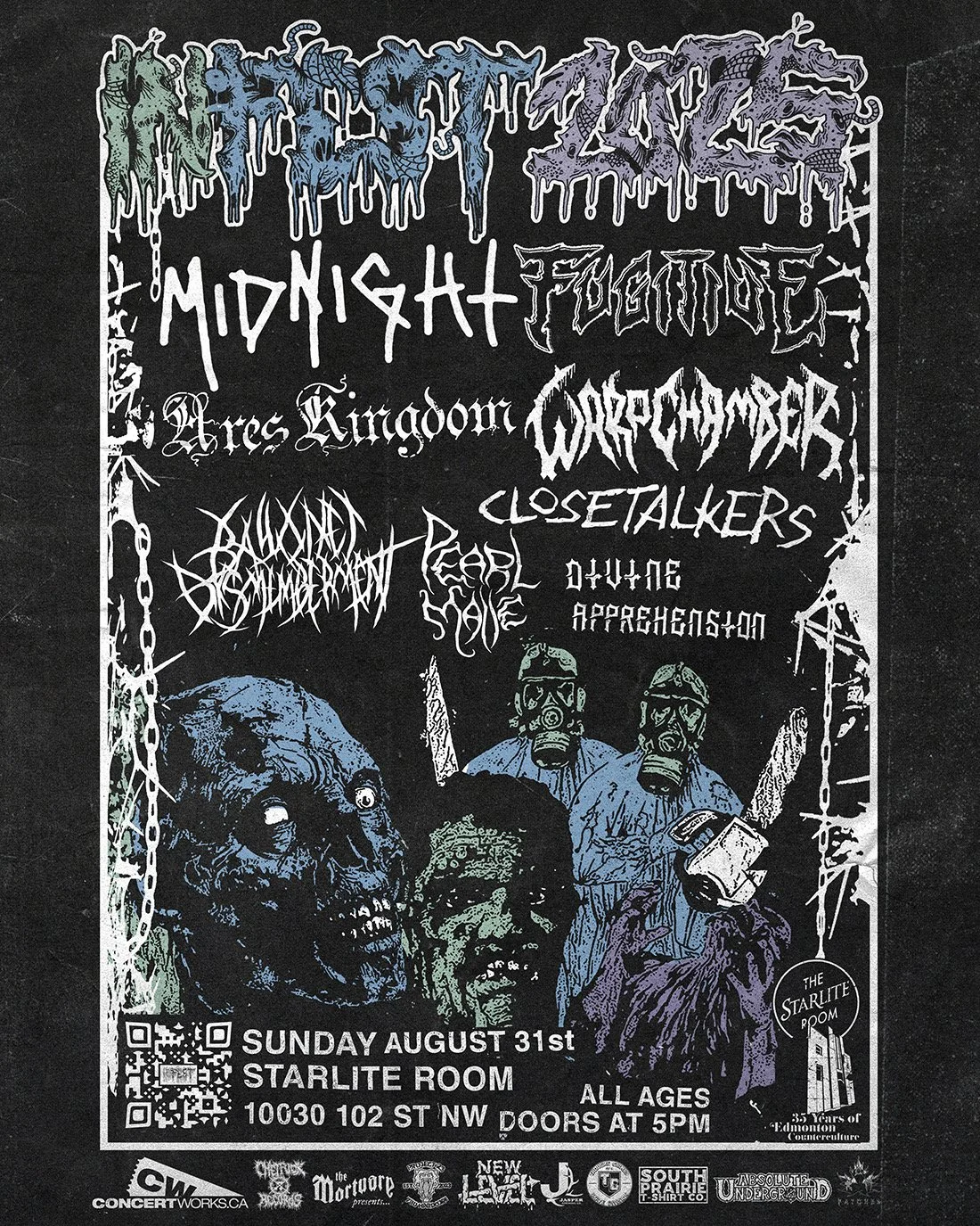 All Ages, Minors WelcomeINFEST with MIDNIGHT, FUGITIVE, WARPCHAMBER, ARES KINGDOM, BAYONET DISMEMBERMENT, CLOSETALKERS, PEARL MALLE, DIVINE APPREHENSION